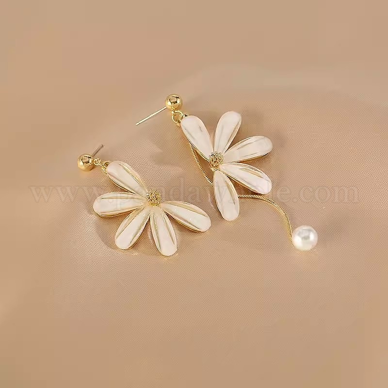 Серьги-гвоздики в виде ромашки с круглой кисточкой из сплава смолы, с пластиковой имитационной жемчужиной, слева и справа