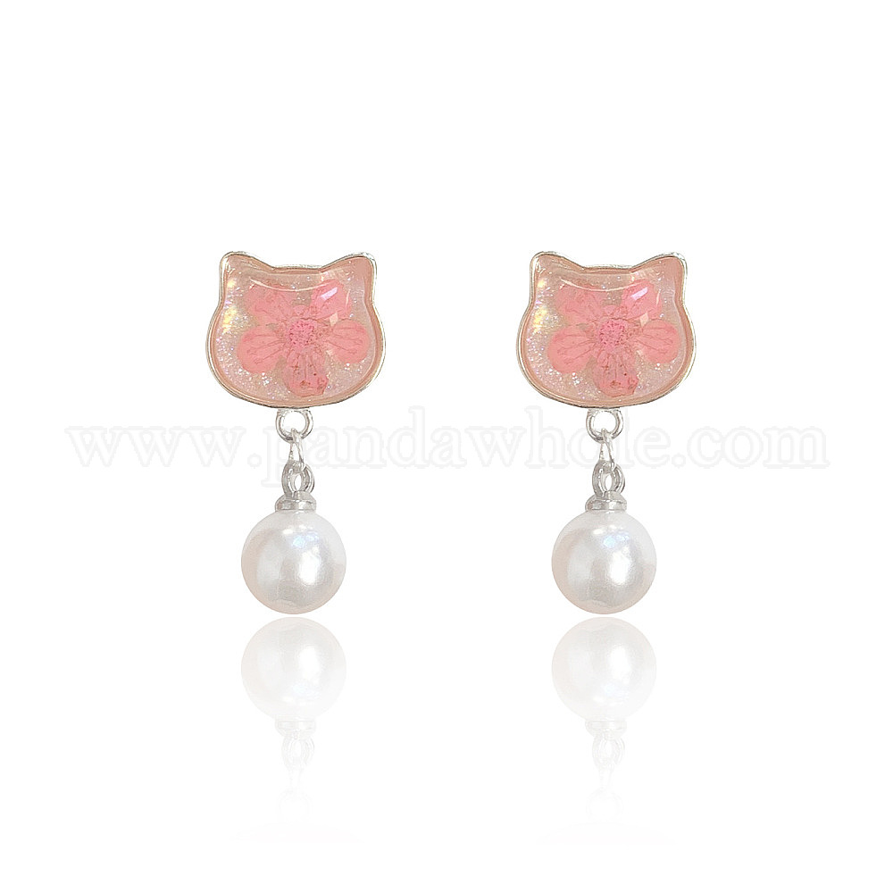 Серьги-гвоздики из сплава и смолы в форме кошки, с пластиковой жемчужины (036W48)