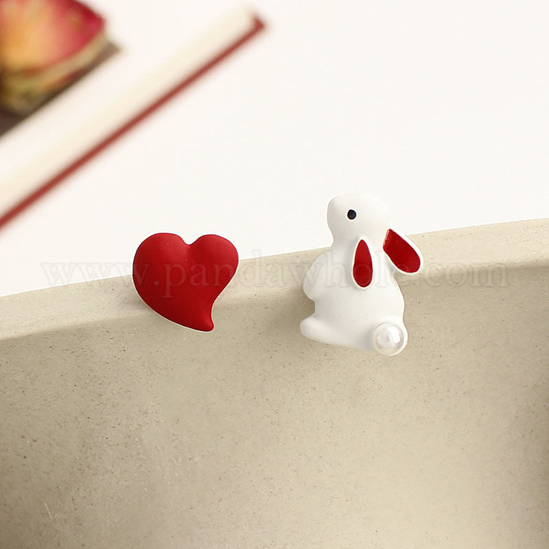 Серьги-гвоздики с эмалевым сплавом в виде кролика с сердцем, платина