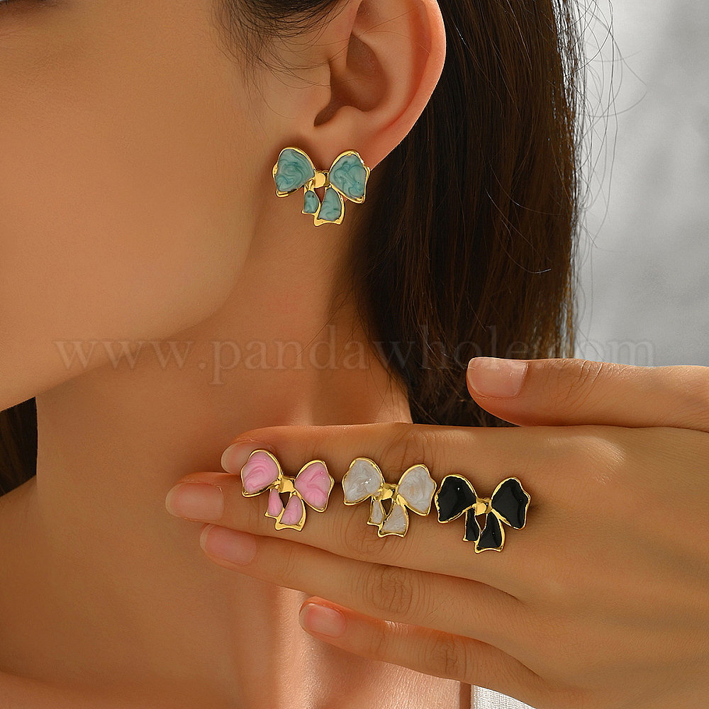 • Белый Серьги-гвоздики из нержавеющей стали с бантом, золотые, белые, 19.8x24.4 мм