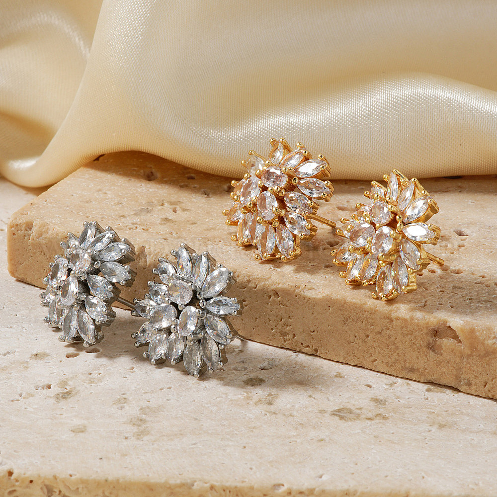 Серьги-гвоздики из латуни со стразами, цветок