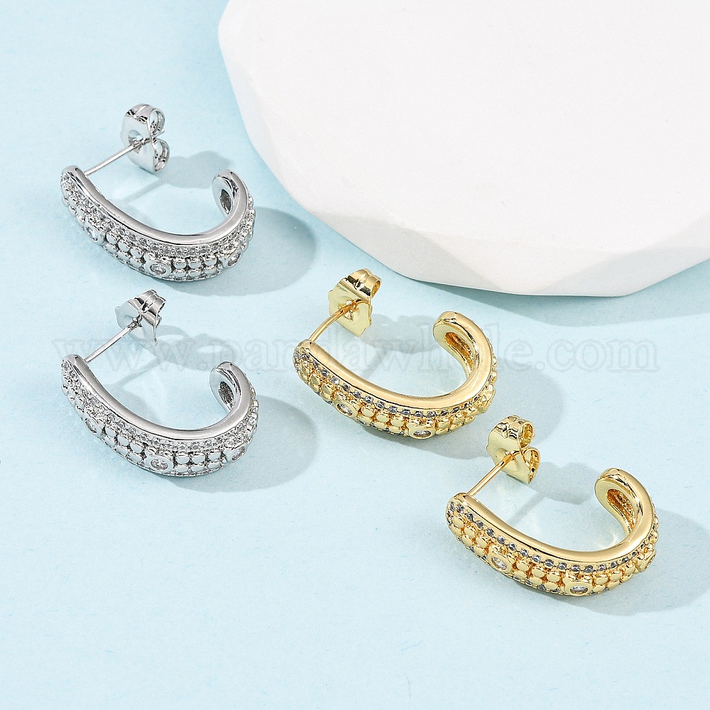 Серьги-гвоздики J-образной формы с микропаве из прозрачных кубических цирконий из латуни