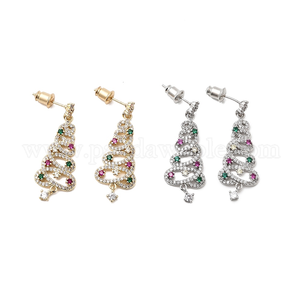 • Золотой Серьги-гвоздики с подвесками из латуни с микропаве из кубических цирконий в виде рождественских елок, золотые, 36x13.5 мм