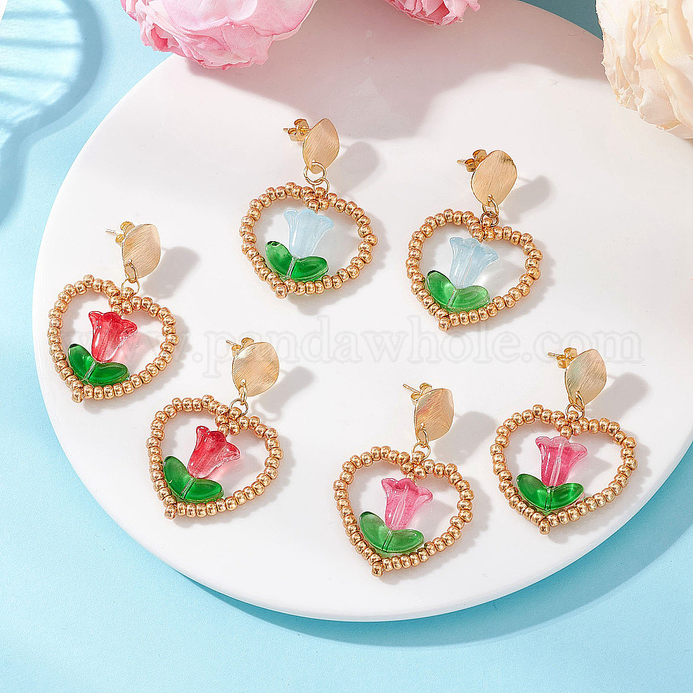 • (52) Непрозрачная лаванда Латунные стекла болтаются серьги, Сердце со цветками , золотые, разноцветные, 42x29 мм, 3 пар / набор