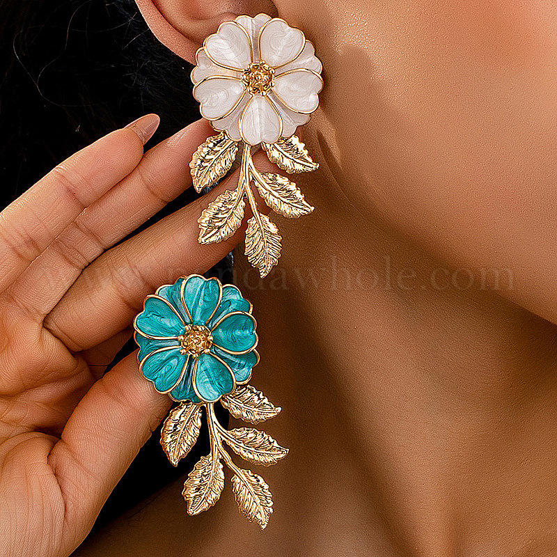Серьги-гвоздики с эмалевым сплавом в виде цветка и листа, золотые