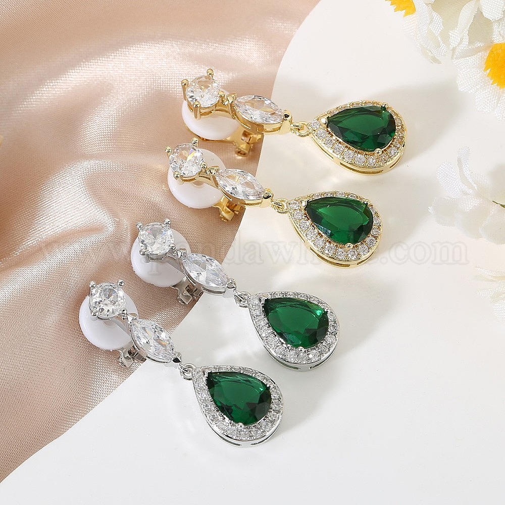 • Платина Серьги-гвоздики с подвесками из латуни с паве из кубических цирконий, конский глаз со слезами, платина, 33x10 мм