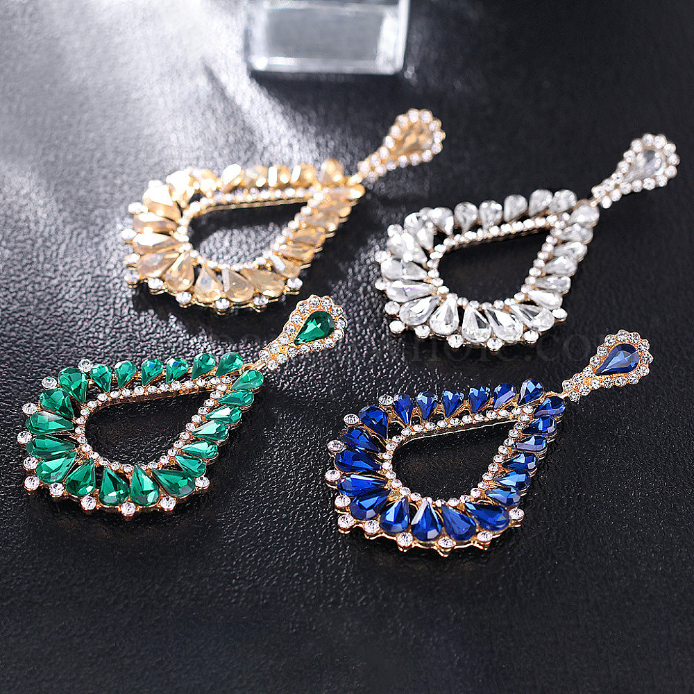 • Прозрачный Серьги-гвоздики в форме капли из цинкового сплава со стразами, со стеклом, золотые, прозрачные, 65x36 мм