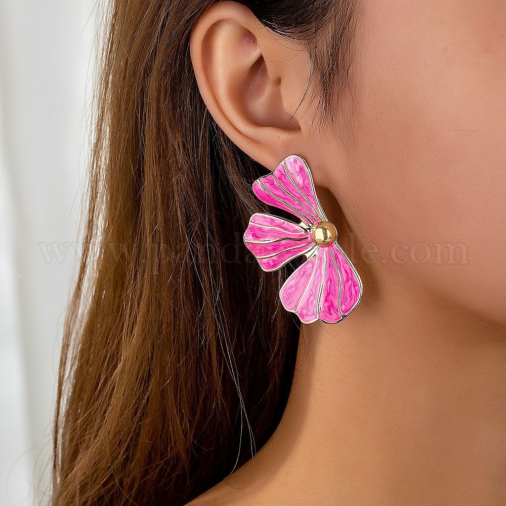 • Ярко-Розовый Сплав эмаль серьги, цветок, золотые, слева и справа, ярко-розовый, 50x28 мм