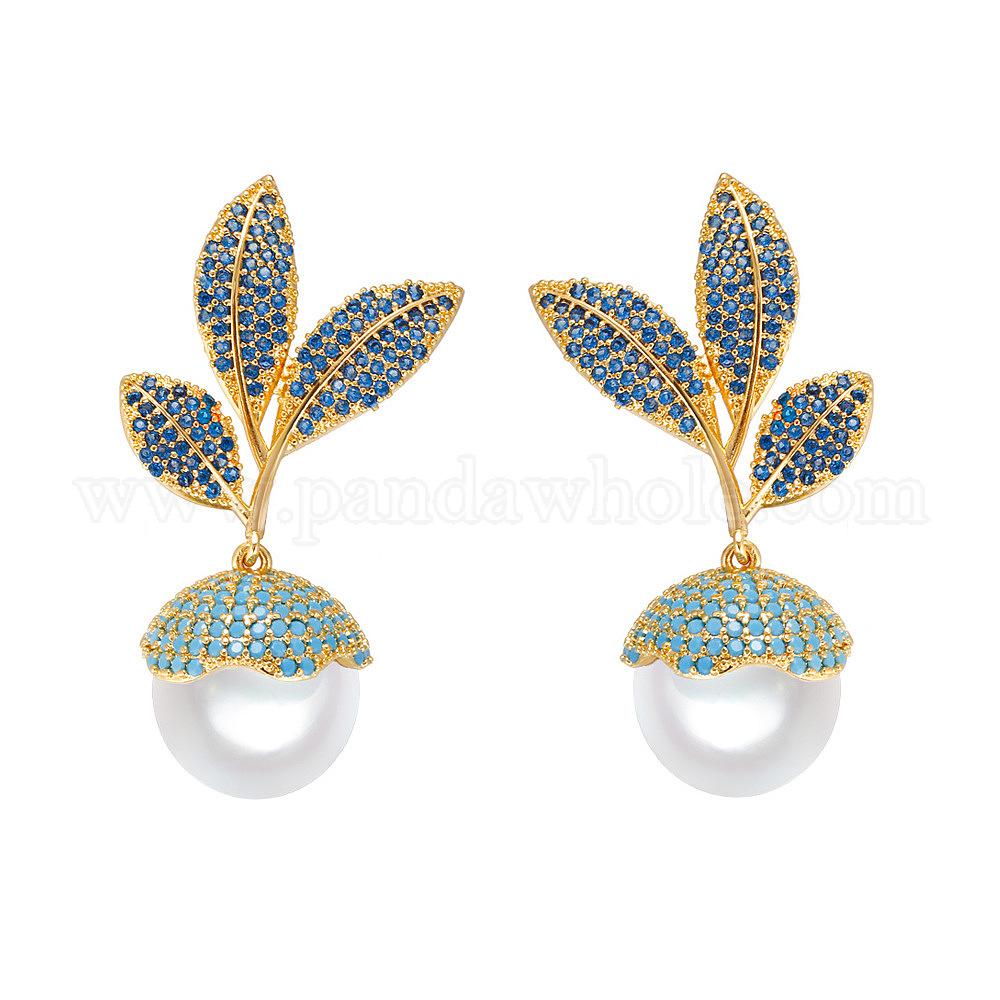 Серьги-гвоздики с листом и круглыми латунными микрофианитами, с пластиковой жемчужины