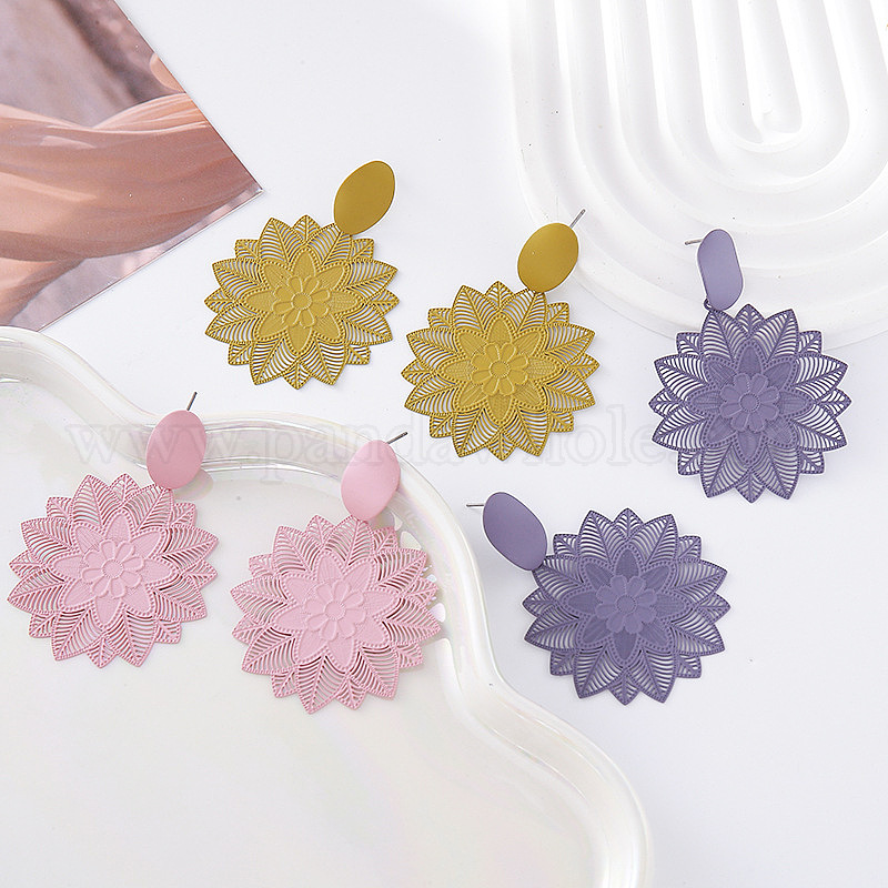 • Pink Сплав мотаться серьги стержня, овальные с цветком, розовые, 62x44 мм