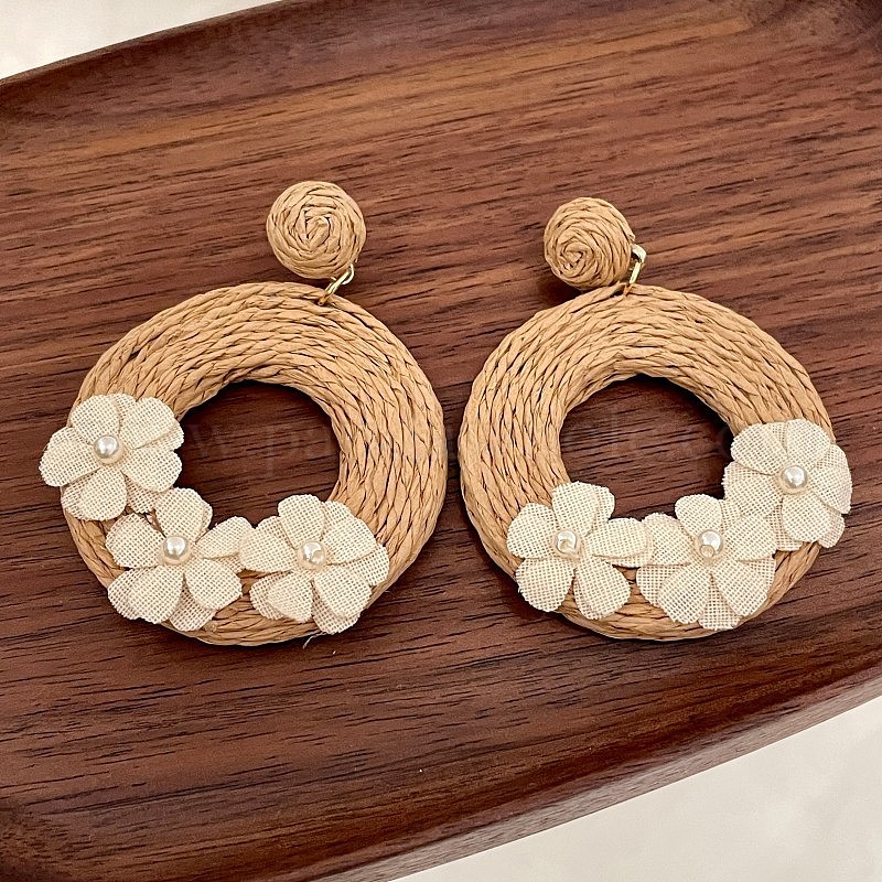 Серьги-гвоздики из рафии и ткани в богемном стиле, Кольцо с цветком, с имитацией жемчуга