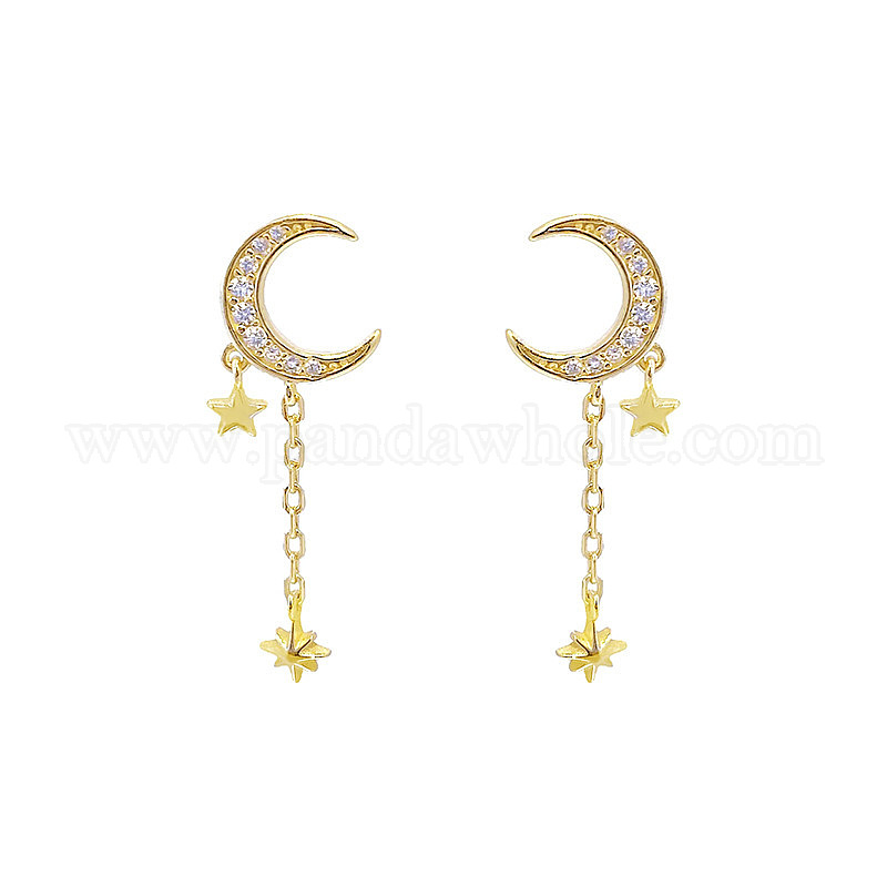 Серьги-гвоздики из латуни с микропаве в виде луны и звезды, украшенные прозрачными кубическими циркониями.