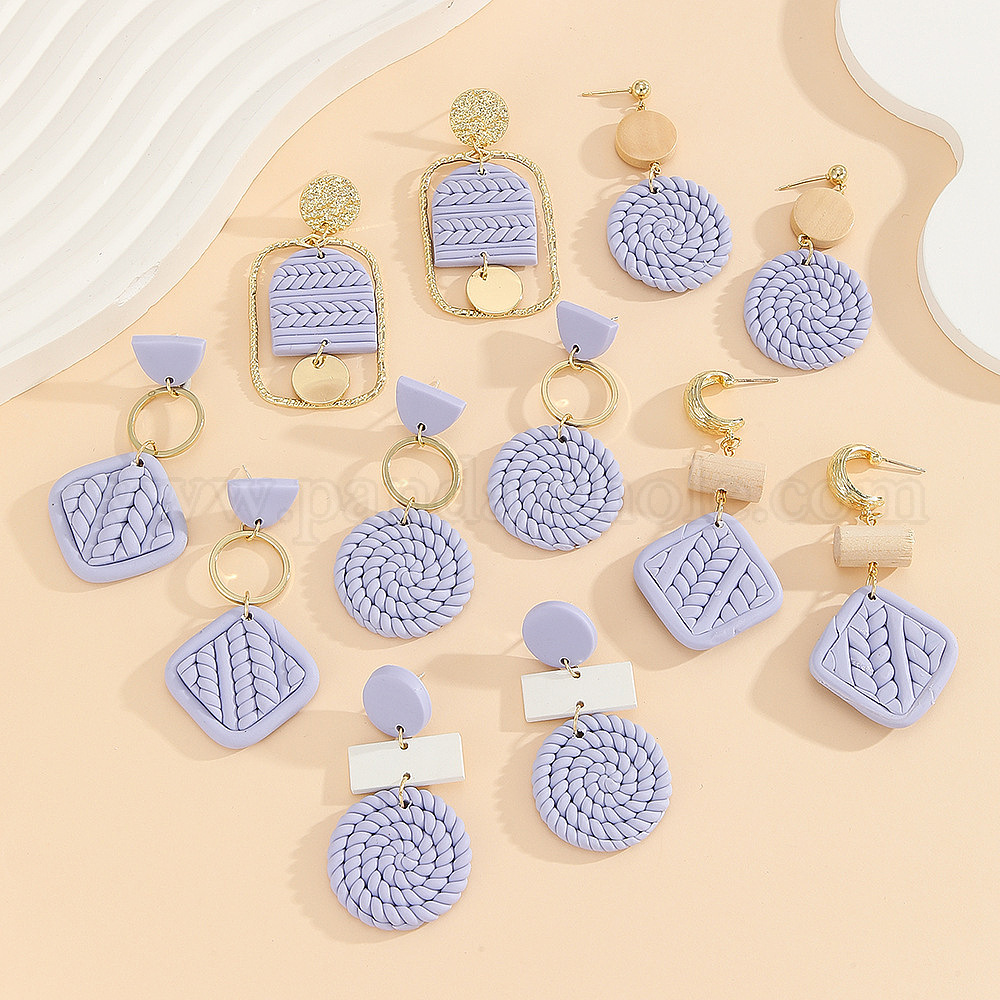 Серьги-гвоздики с подвесками из полимерной глины, сплава и дерева., золотые, сирень