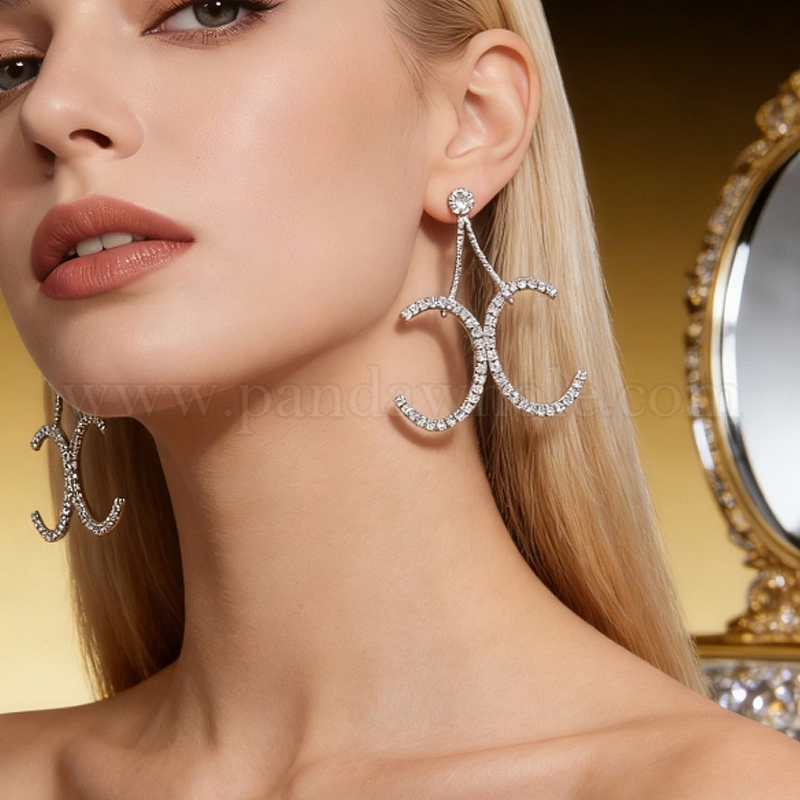 • Серебро Латунные серьги-гвоздики с подвеской в виде буквы X и линии, со стразами, серебряные, 56x55 мм