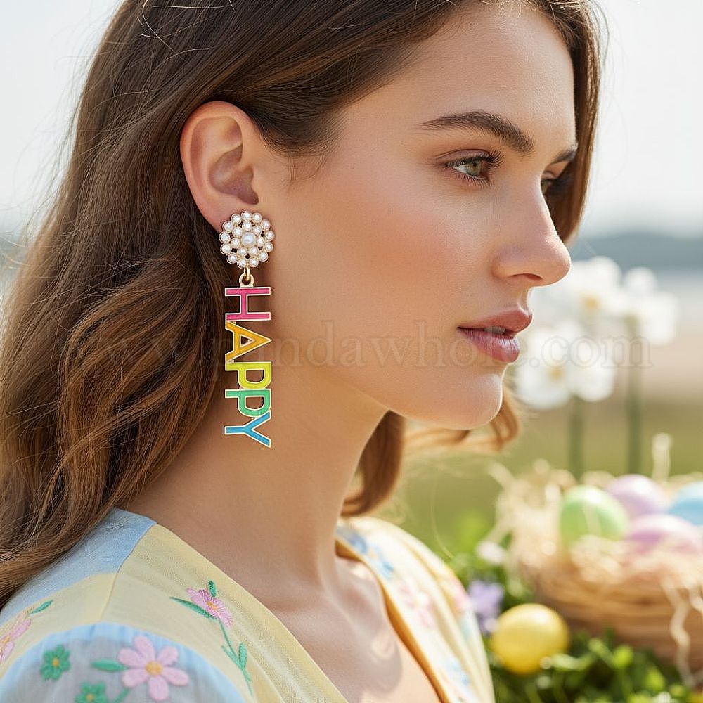 Серьги-гвоздики из цинкового сплава с эмалью, надпись «Счастливой Пасхи», с имитацией жемчуга, слева и справа, золотые