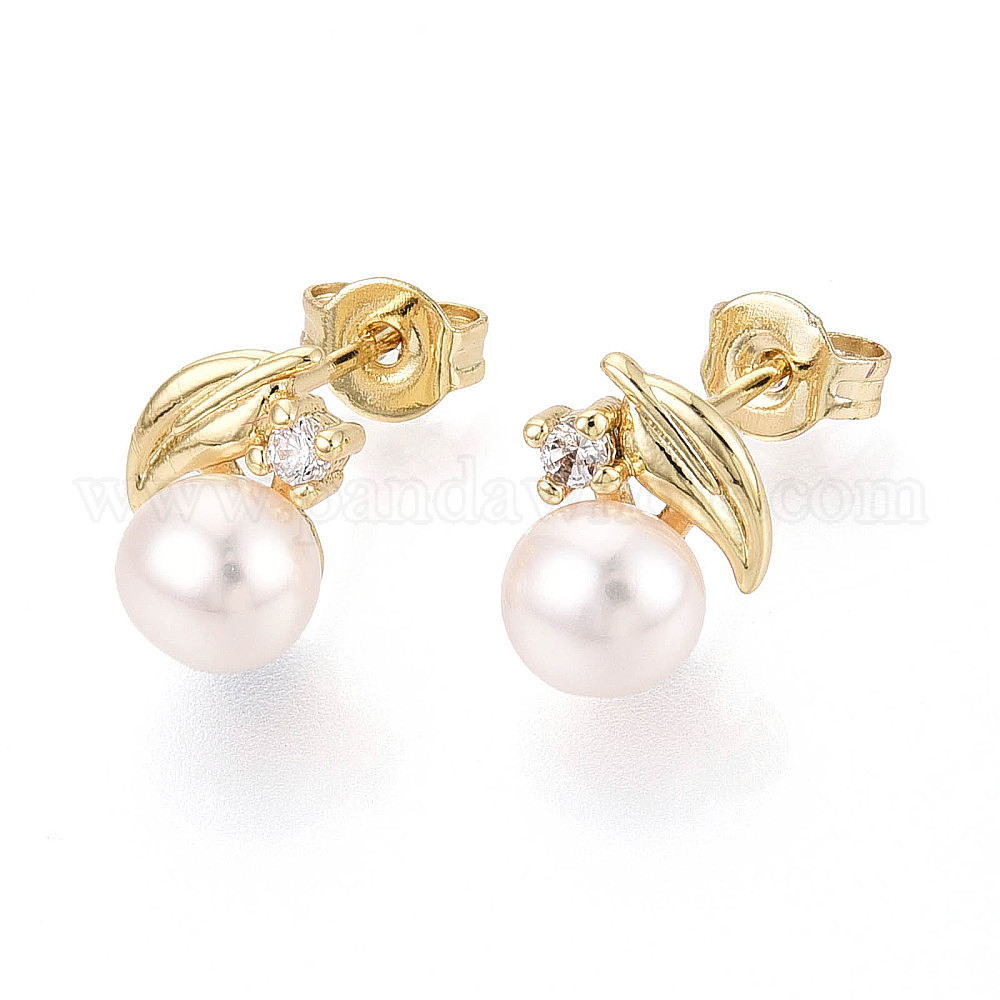 • Настоящее золото 18K Серьги-гвоздики из латуни с микропаве из прозрачных кубических цирконий, с натуральной жемчужиной, реальный 18 k позолоченный, 9.5~10x7.5~8 мм