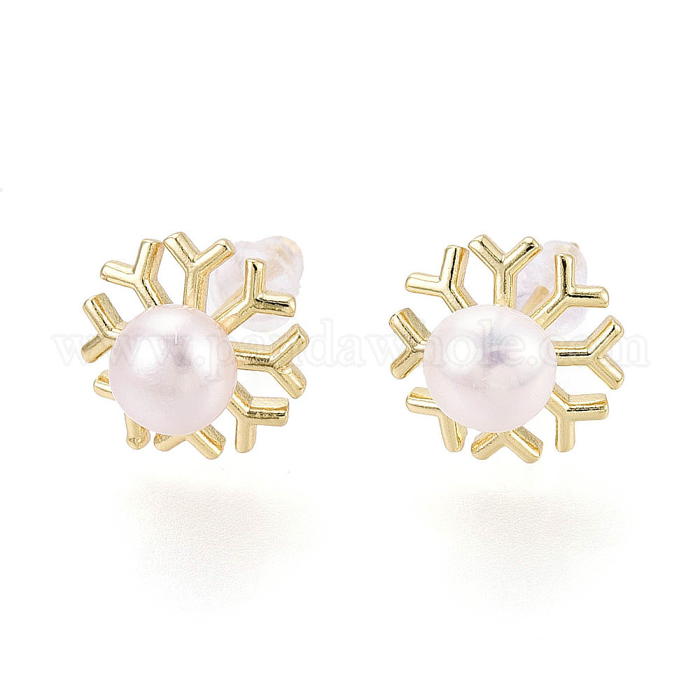 • Настоящее золото 18K Серьги-гвоздики из латуни и натурального жемчуга, снежинка, реальный 18 k позолоченный, 10.5 мм