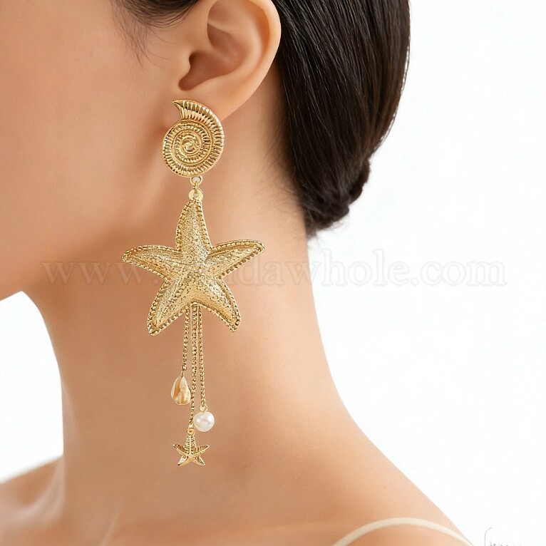 Сплав мотаться серьги стержня, с пластиковыми жемчужинами и натуральной раковиной, в форме раковины с морской звездой