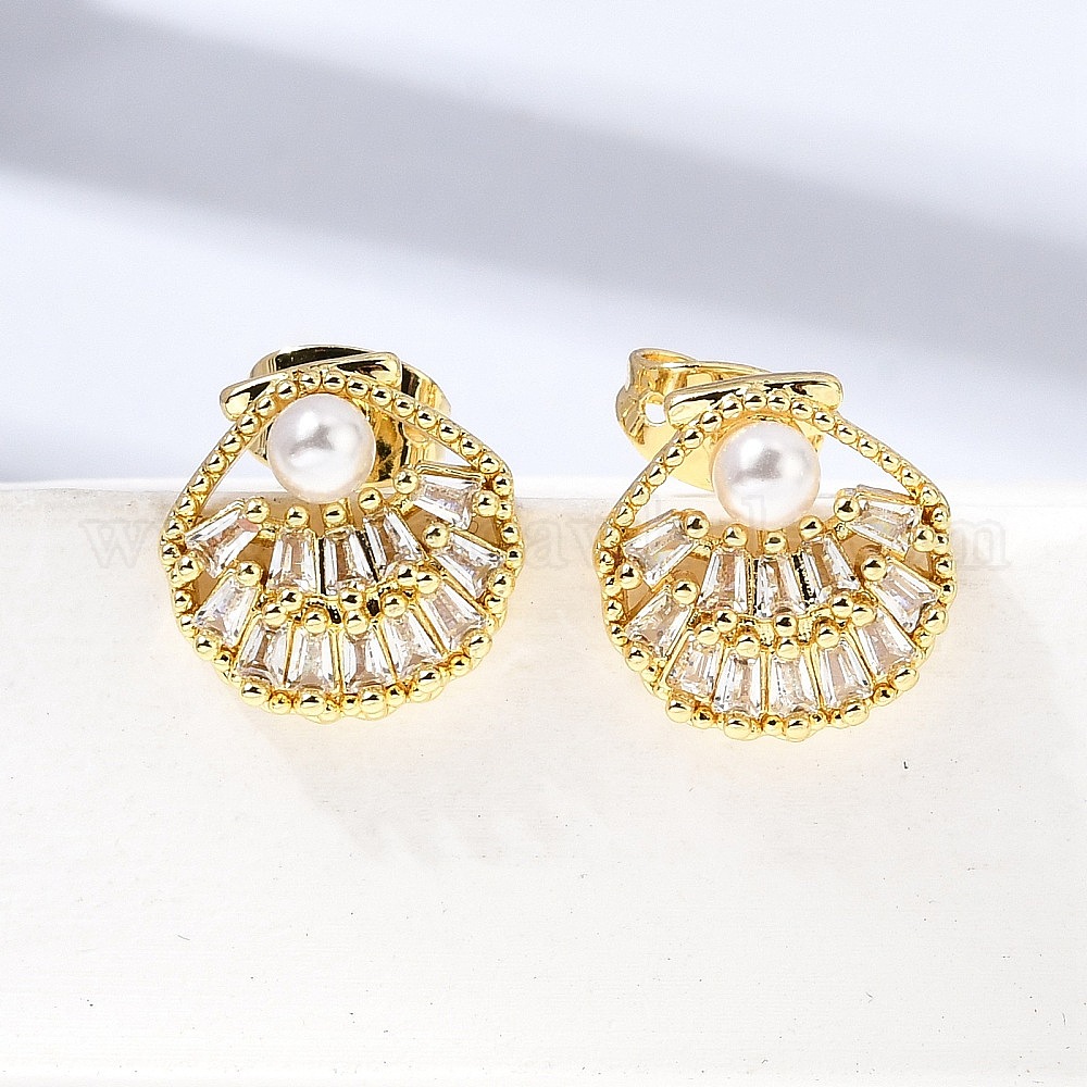 Серьги-гвоздики из латунного микро-паве, формы раковины, с абс пластмассовой имитационной жемчужиной, стойки покрытие, долговечный, без кадмия и без свинца