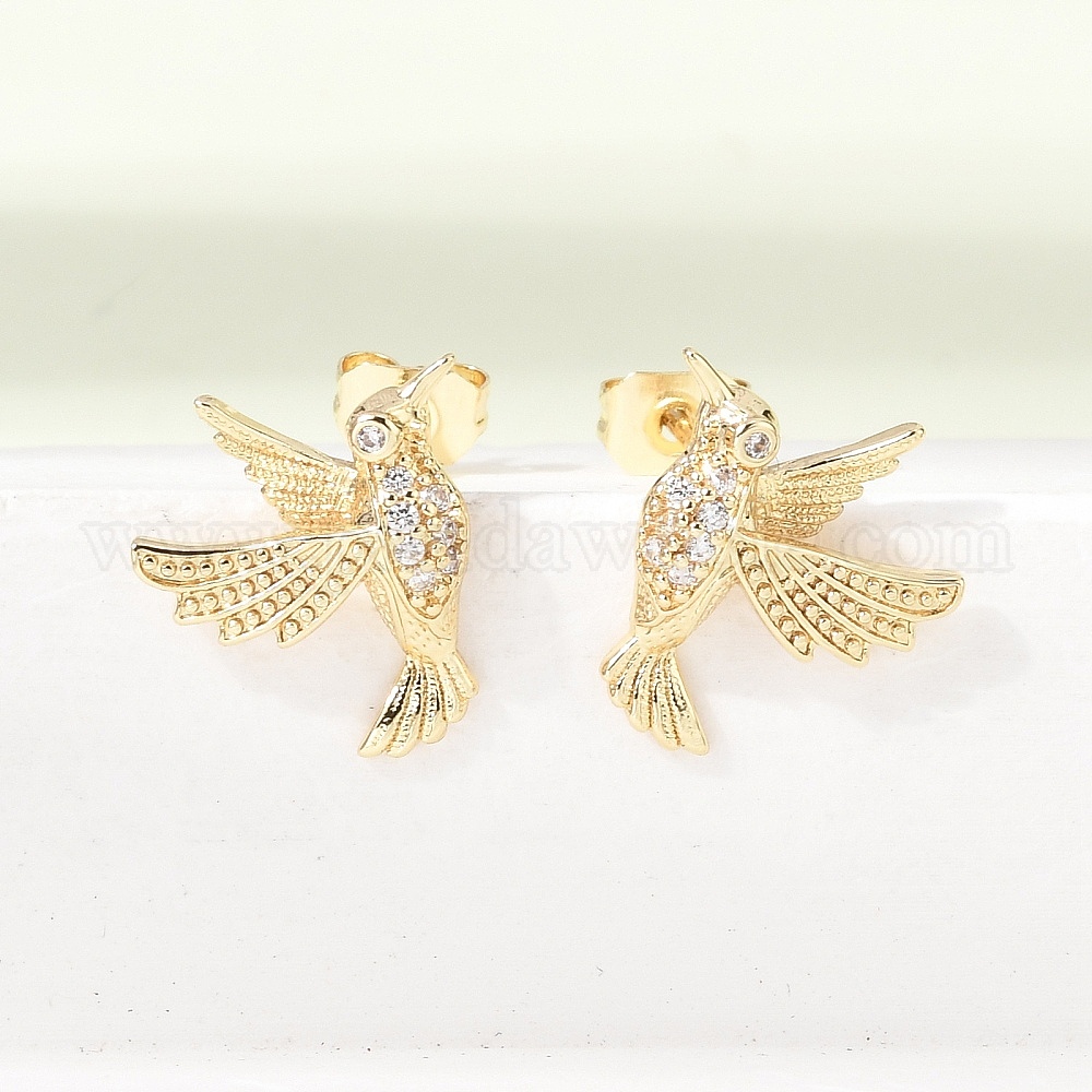 Серьги-гвоздики из латуни с микропаве в виде колибри, украшенные прозрачными кубическими циркониями., стойки покрытие, долговечный, без кадмия и без свинца