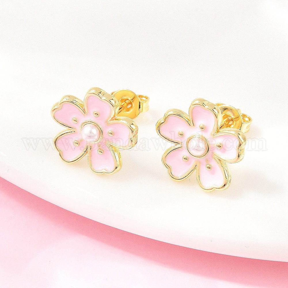 • Pink Цветок латунь эмаль серьги стержня, с ABS имитации жемчуга, долговечный, без свинца и без кадмия, реальный 18 k позолоченный, розовые, 12.5x12 мм