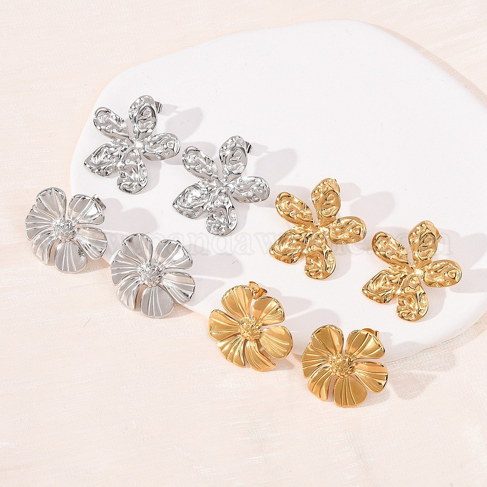 • Нержавеющая Сталь Цвет День святого Валентина 304 серьги-гвоздики из нержавеющей стали, фактурный цветок, обработанный молотком, цвет нержавеющей стали, 26x25.5 мм