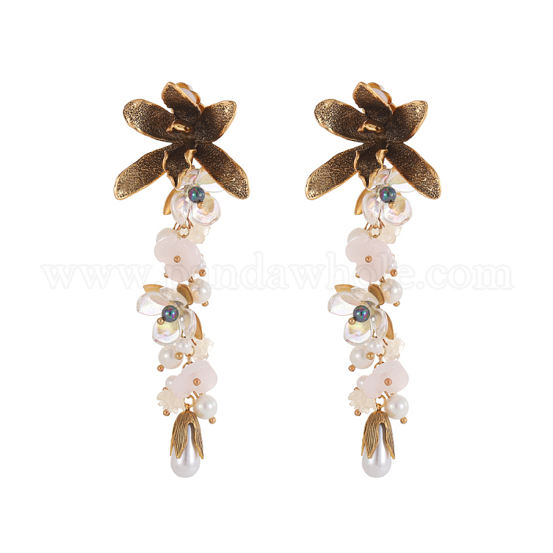 Серьги-гвоздики из латуни с цветком, Серьги-подвески в форме капли из розового кварца и искусственного жемчуга., античное золото