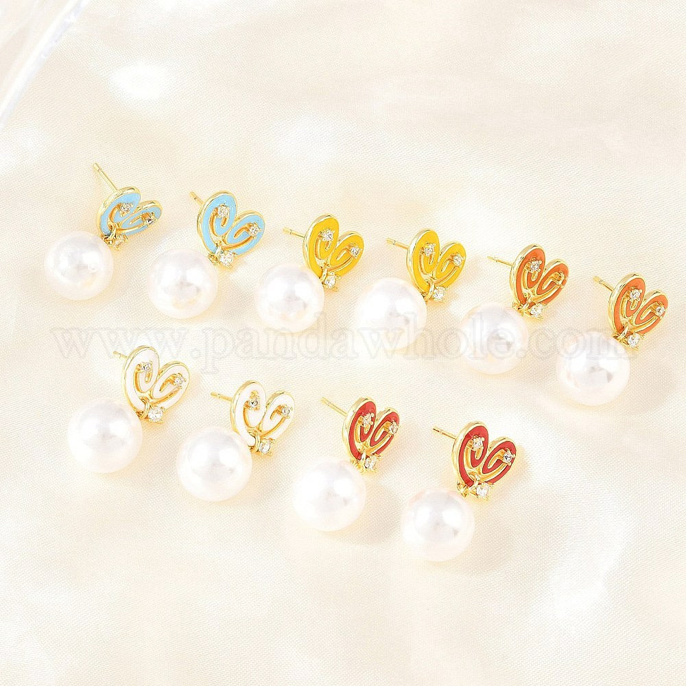 • Желтый Серьги-гвоздики из латуни с прозрачными кубическими циркониями ко Дню святого Валентина, с абс пластиком имитация жемчуга и эмали, без кадмия и без свинца, долговечный, стойки покрытие, реальный 18 k позолоченный, желтые, 26x13.5 мм