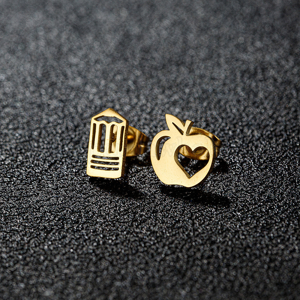 День учителя 304 серьги-гвоздики из нержавеющей стали, яблоко и карандаш, слева и справа (03BNHX)