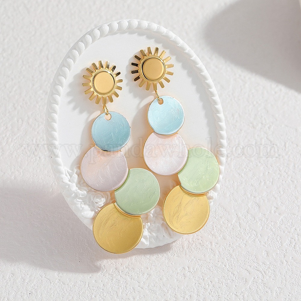 • Разноцветный 304 из нержавеющей стали болтаться серьги, плоские круглые с солнцем, золотые, красочный, 69x30 мм