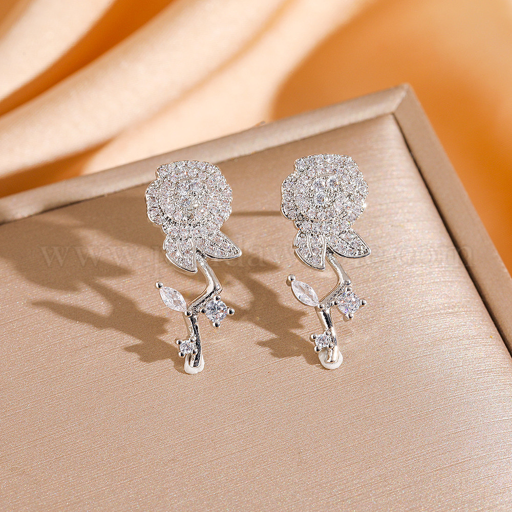 День святого Валентина 304 Серьги-гвоздики из нержавеющей стали и прозрачного кубического циркония, цветок розы, с фурнитурой латунной для серег