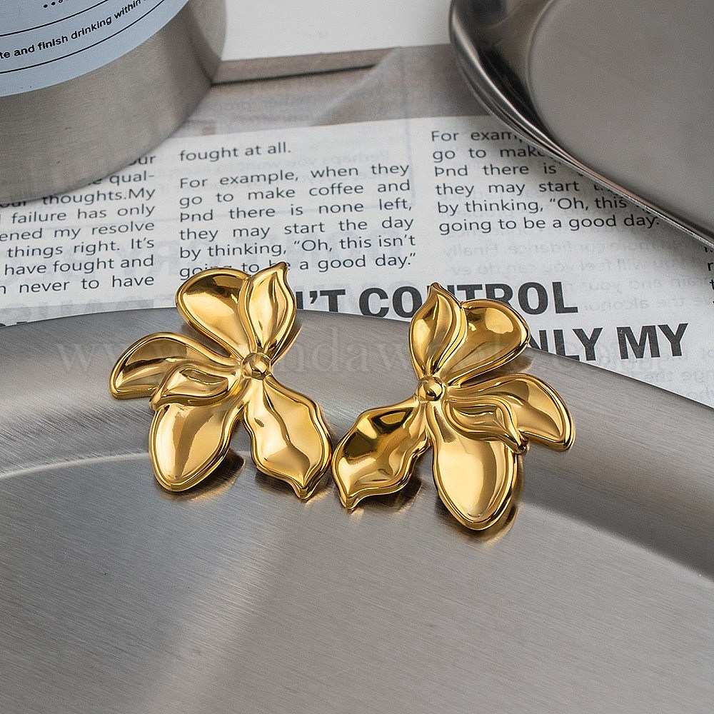 • Золотой День святого Валентина 304 Серьги-гвоздики из нержавеющей стали для женщин, цветок, золотые, 33x41.5 мм
