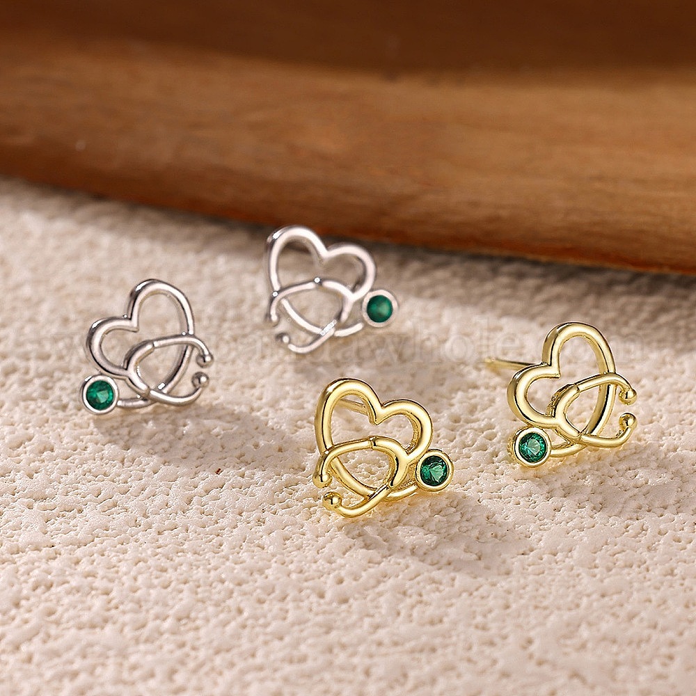 Латунные серьги-гвоздики с микропаве из зеленых кубических цирконий для женщин, сердце со стетоскопом (03BW9N)
