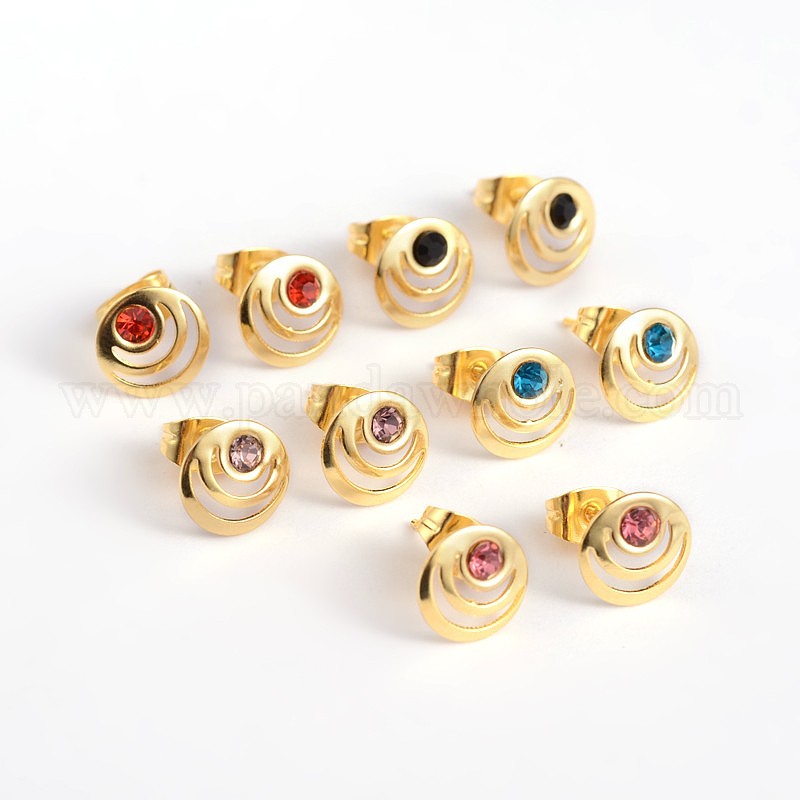 Плоские круглые золотые тона 304 из нержавеющей стали горный хрусталь серьги шпильки, 9 мм , штифт: 0.6 мм