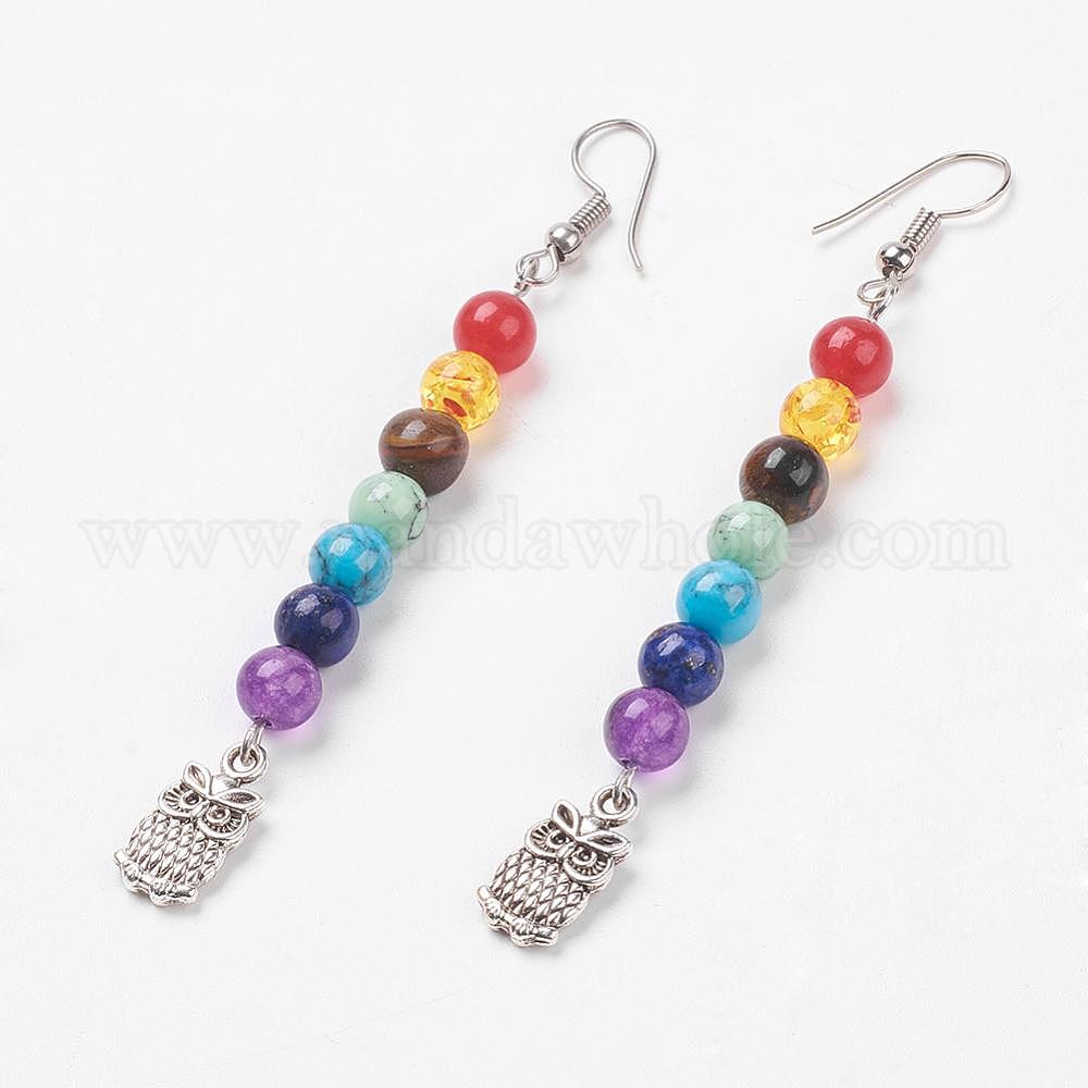 Драгоценные камни чакры свисающие серьги, С латунными крючками для серьги и подвесками из сплава, сова (00PCTP)