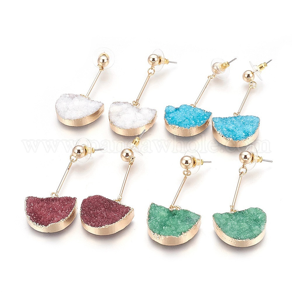 Натуральный druzy кварц болтается серьги стержня, с фурнитурой латунной золотого тона, полукруглый
