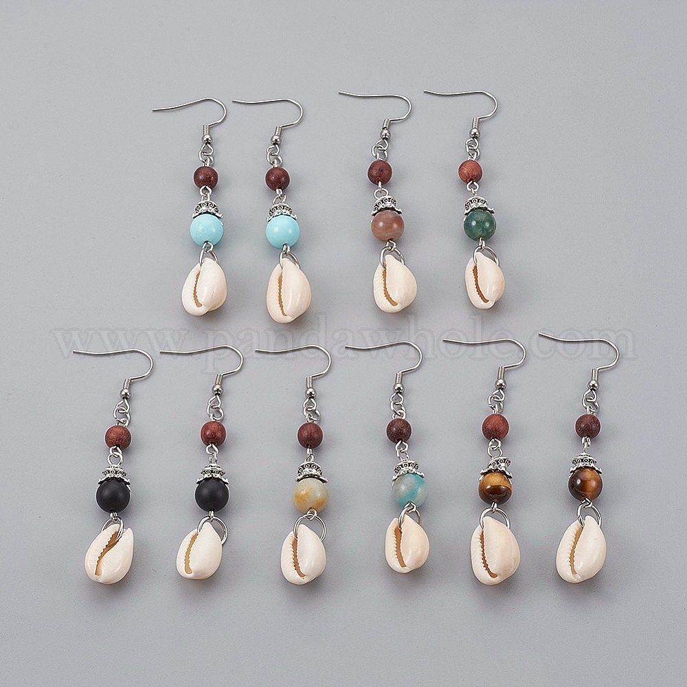 Круглые серьги болтаться драгоценного камня, с каури, бусины из натурального сандалового дерева и серьги из нержавеющей стали 304