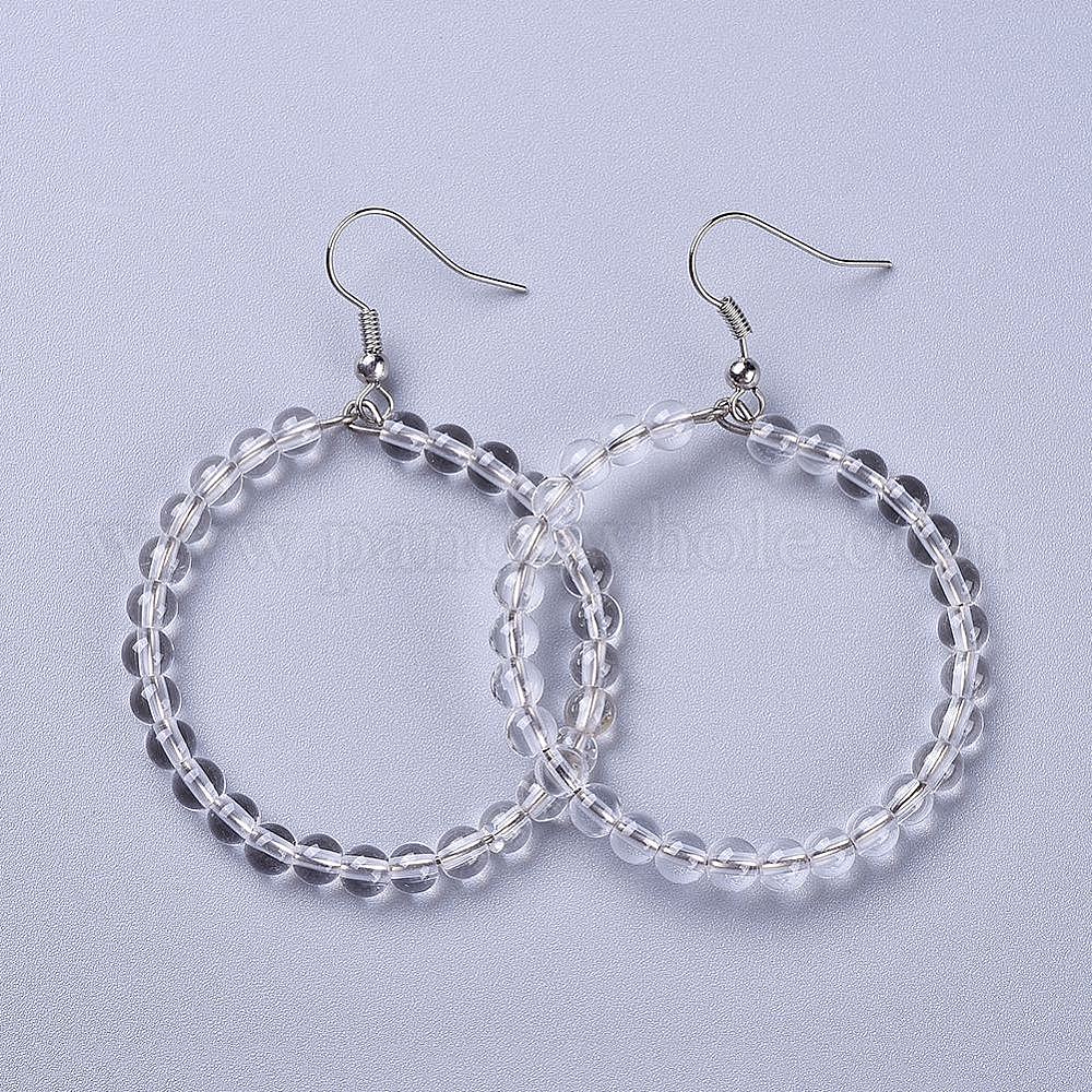 • Хрусталь Натуральный кристалл кварца мотаться серьги, с крюком из нержавеющей стали, кольцо, 60~61x44 мм , штифт: 0.6 мм