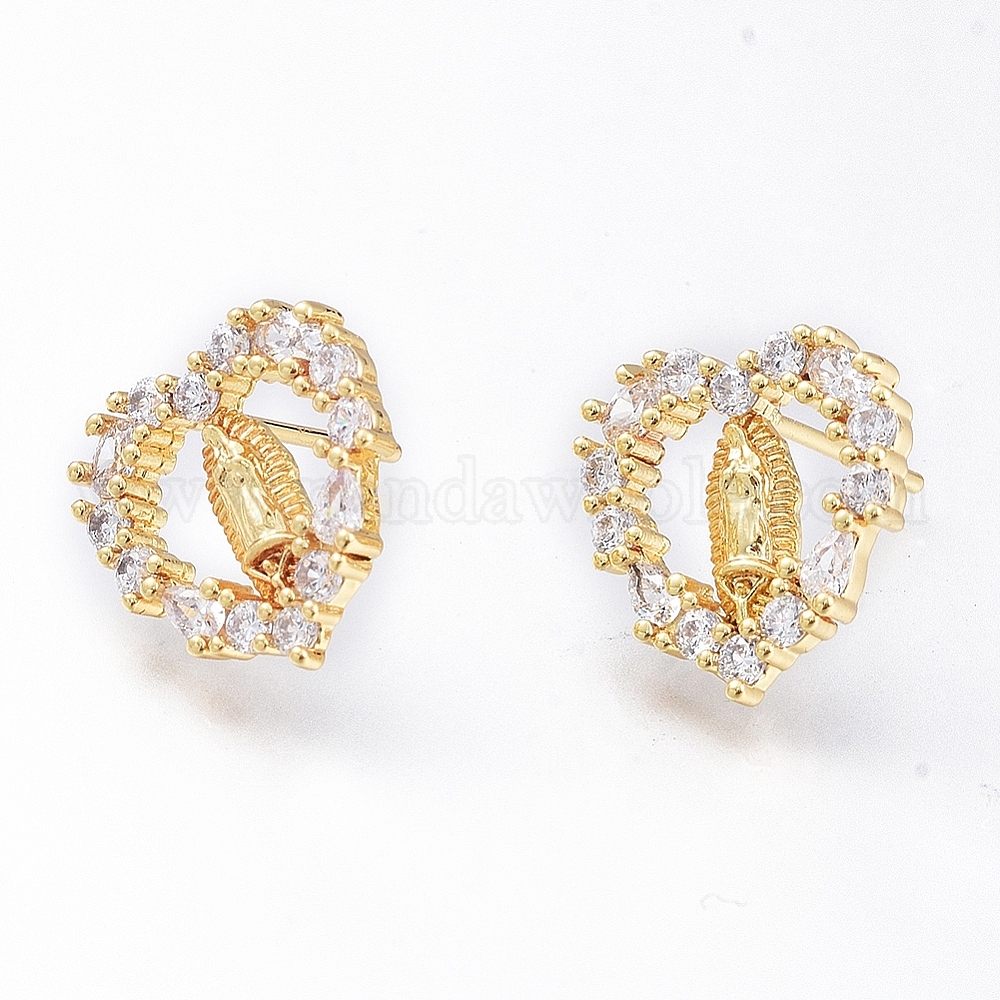 Латунные микро проложить кубического циркония уха шпильки, долговечный, Сердце с Девой Марией, золотые