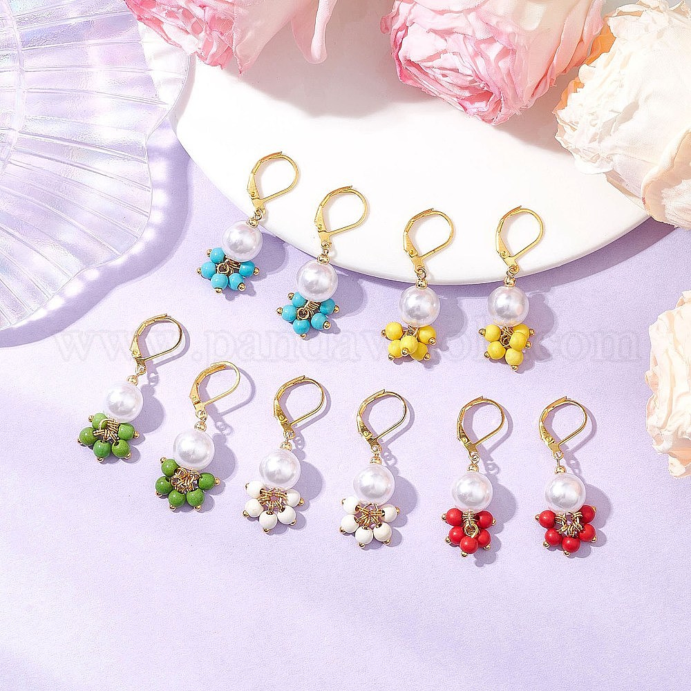 5пара латунных круглых серег с застежкой-рустиком, с искусственным жемчугом из АБС-пластика и синтетической бирюзой
