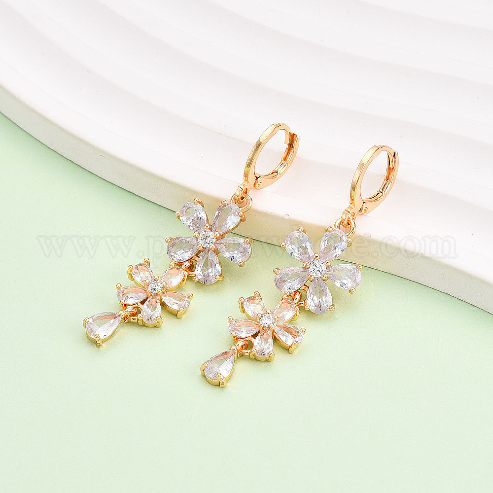 Серьги с застежкой-защелкой из латуни с прозрачным фианитом и прозрачным фианитом, долговечный, цветок, золотые