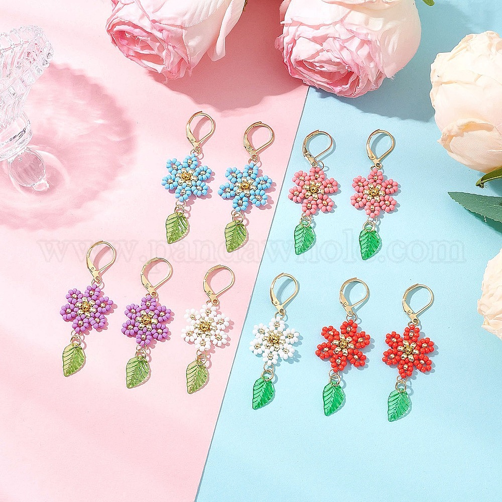 304 серьги-гвоздики с застежкой-молнией в форме цветка и листа из нержавеющей стали, со стеклянными бусинами, нейлоновой проволокой и акриловыми подвесками, золотые