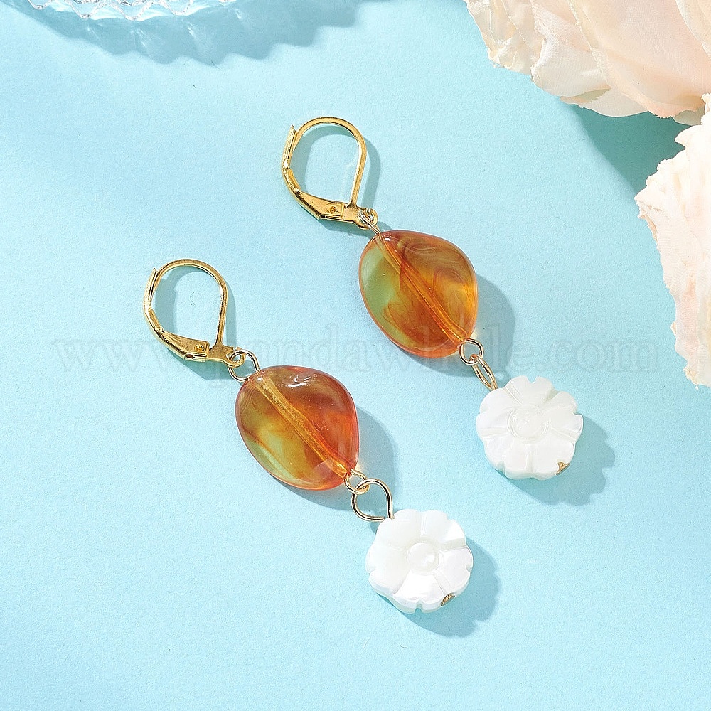 • Золотой Серьги-гвоздики с цветочной ракушкой и акриловым креплением, с  латунными крючками для серег, золотые, 55x13 мм