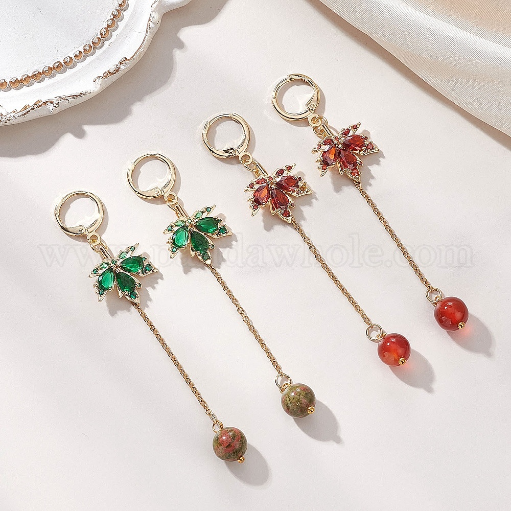 Серьги-подвески из латуни с микропаве из кубического циркония и застежкой-крючком в виде кленового листа., с фурнитурой латунной для серег, золотые