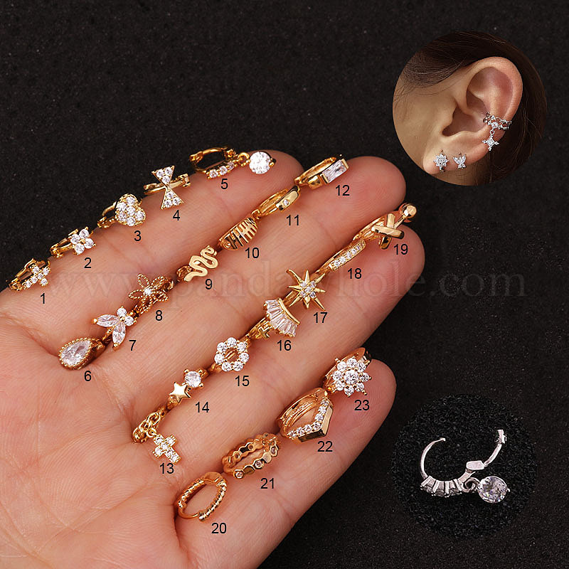 Серьги-кольца с микропаве из латуни и прозрачным кубическим цирконием для крепления на хрящ