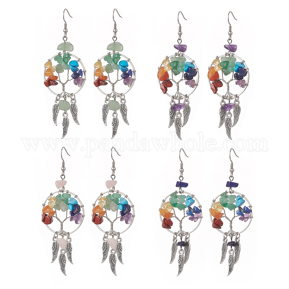 • Смешанные камни Дерево жизни из натуральных и синтетических смешанных драгоценных камней с серьгами-люстрами из перьев из сплава, 304 женские украшения из нержавеющей стали, 82 мм, штифты : 0.6 мм