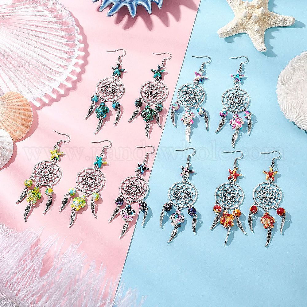6пары 6цвета сплава и синтетической бирюзы серьги-люстры, с 316 хирургическими серьгами из нержавеющей стали для женщин, плоские круглые с крылом, античное серебро