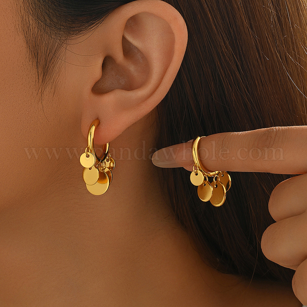 • Настоящее золото 18K Плоские круглые серьги-люстры из нержавеющей стали, реальный 18 k позолоченный, 6~10 мм