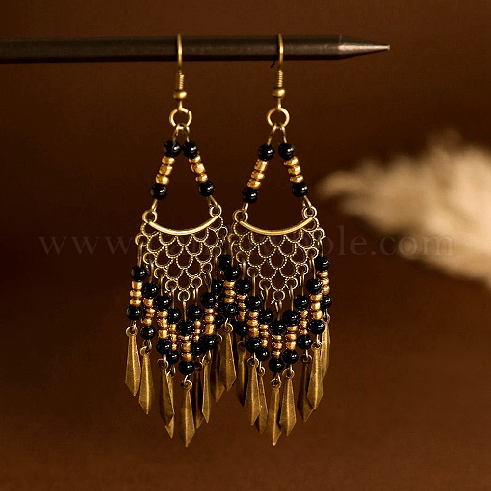 Винтажные богемные серьги-люстры с кисточками, украшенные бусинами из сплава и смолы.