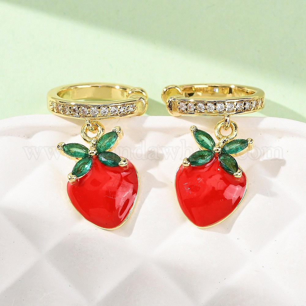 Латунные серьги-манжеты из прозрачного кубического циркония, с эмалью, клубника, без кадмия и без свинца, долговечный, стойки покрытие